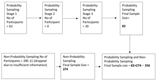 In the second phase, a total of 500 questionnaires were distributed. Direct contact with the CEO/MD and their personal staff was made by visiting the head offices. However, due to the important position of the respondent, it was not always possible to make personal contact. Hence, we left the questionnaire with his/her office and collected it after 3-4 days. This approach was used to reduce time-based response bias. We also made a reminder call before the follow-up visit to collect the questionnaire in order to improve the response rate. Under this strategy, 285 questionnaires were received. Eleven responses were dropped from analysis due to insufficient information and lack of knowledge about environmental activities. The total number of usable responses was 356. The data collection process is explained in Figure 2.