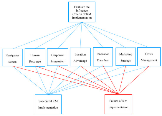 The COVID-19 outbreak has significantly created global economic, political, and social consequences worldwide. This unpredictable disaster of monumental importance has not only reduced business revenues, but also changed consumer behavior and demand [17,18,19,20,21]. The greatest consideration is merely to survive in an uncertain internal and external environment influencing possible global performance of productivity and competitiveness [22]. Therefore, the franchise hospitality sector must continuously examine both their explicit and their implicit management strategies to satisfy changeable consumer demand and sustainable development to enhance organizational performance [23]. In particular, KM can play a critical role during the COVID-19 outbreak; thus, accurate KM implementation can lead organizations toward survival during the pandemic while supporting successful performance. This study investigates a portion of the influential criteria necessary for successful KM implementation to take place. These criteria may be divided into seven recognizable dimensions: headquarters system, human resources (HR) strategy, corporate imagination, location advantage, innovation and transformation, marketing strategy, and crisis management [24].