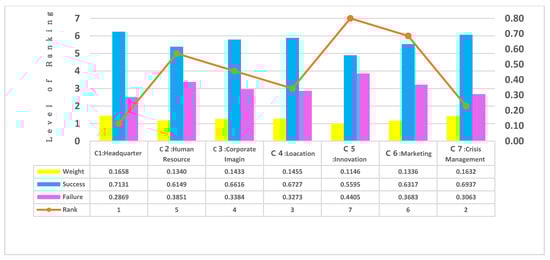 A total of 15 questionnaires were dispatched, and evaluators included four franchisees, four franchisors, four scholars, and three franchise hospitality employees. All of the evaluators were involved in the franchise hospitality field for 10–40 years, with an immediate understanding of the COVID-19 outbreak situation as it unfolded [25]. A clear KM model can guide the hospitality sector to overcome the global crisis. Evaluators identified KM’s influence to identify and implement successful criteria and attributes. These criteria could be summarized as follows: C1 headquarters system; C2 human resources; C3 corporate imagination; C4 location advantage; C5 innovation and transformation C6 marketing strategy; C7 crisis management. An analytic hierarchy framework reliant upon seven major influential criteria is illustrated in Figure 2 [12,53].