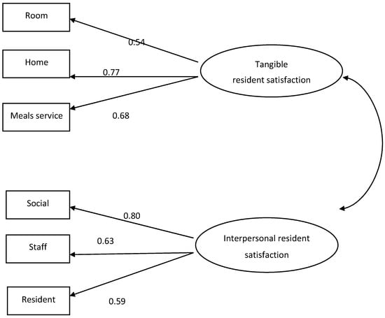 To identify the two categories of resident satisfaction—tangible and interpersonal aspects—further analyses were conducted. We averaged the three items of room, the four items of home, and the four items of meals service to form a composite measure of tangible resident satisfaction. Then, the three items of social interaction, the three items of staff care, and the three items of resident involvement were combined to obtain a composite measure of interpersonal resident satisfaction. The Cronbach alpha coefficients for tangible and interpersonal were 0.69 and 0.72, respectively, and standardized factor loadings ranged from 0.54 to 0.80 (Figure 1). The value of the normed chi-square was 1.37; the CFI was 0.98; the TLI was 0.9; and the RMSEA was 0.05, showing acceptable fit for the proposed constructs across the data.