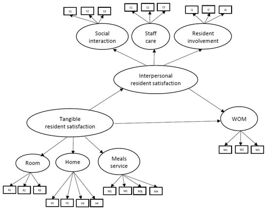 Tangible aspects, such as physical facilities and environments, may be important when residents look for a CCRC or at the beginning of residents’ lives in the CCRC. As residents stay with the community for long durations, their needs are expected to shift from the tangible aspects toward the interpersonal aspects (i.e., social interaction and engagement) because of the decaying effect [,] and the demanding needs for social and emotional support. CCRC residents get accustomed to the design and ambience in the community with time through the habituation effects, defined as a “decreased response to repeated stimulation” [,]. Further, third places are significantly meaningful to older adults because of the social relationships associated with and attached to the place rather than the place per se []. Therefore, interpersonal aspects of resident satisfaction are likely to impact WOM more than tangible aspects, and they are likely to mediate the relationship between tangible aspects of resident satisfaction and WOM. This understanding leads to the following hypotheses: