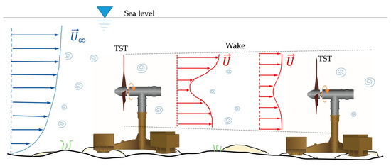 Figure 1 provides the schematic lateral view of a two-row tidal stream turbine array, and highlights the key components of each turbine, namely a supporting structure laid on the seabed, a short tower supporting the nacelle, and the bladed rotor.