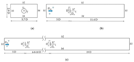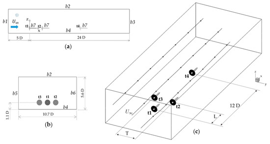 Figure 2c. This configuration results in the downstream turbine operating in the wake of the front turbine. The boundary conditions for these two-turbine simulations are also indicated in
