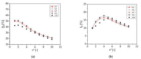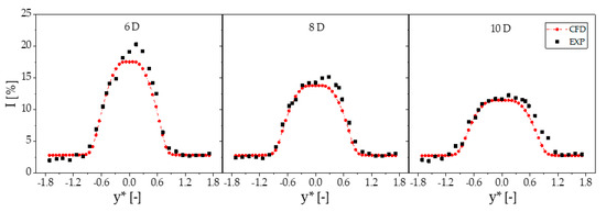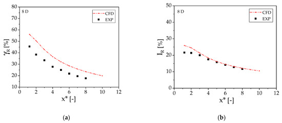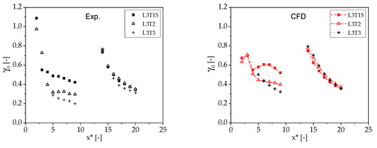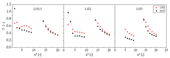 Figure 14 highlight fair agreement between experiments and simulations. Both result sets predict a sharp increment of γ at x* = 14D with respect to the value at x* = 10D, which is due to a velocity reduction across turbine t4 positioned at x* = 12D. Measurements and simulations also present comparable velocity gradients on the same centerline except for the region between 0 and 3D. The position x* = 3D is where the two lateral turbines are placed, and their wakes start interacting with that of the front turbine. The measured and computed levels of the γ profiles present some discrepancies, particularly downstream of the front turbine t1. It is noted, however, that the profiles in
