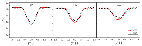 The measured and computed wake velocity profiles at 3D, 6D and 8D behind the downstream turbine for the case in which the downstream turbine is at 8D from the front turbine are compared in