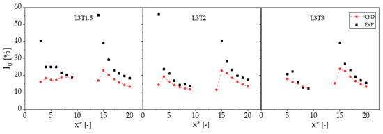 was made after a parametric study aiming to minimize the variation of turbulence intensity with respect to the value of 3% measured in the experiment and enforced at the inlet boundary of the simulations reported in this section. Blackmore et al. [