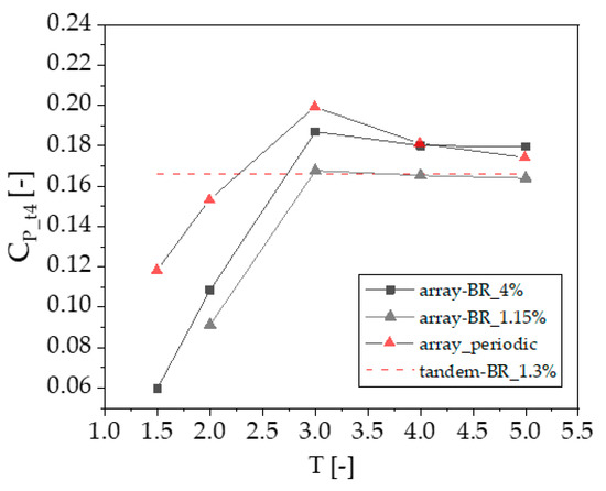 Figure 17, whose x-axis reports the transverse spacing T of turbines t2 and t3. The curve labeled ‘tandem BR 1.3%’ refers to a simulation in which the width W of the flume tank cross section equals the real value of 3 m, and only turbines t1 and t4 are included; for this reason, this power coefficient estimate of 0.167 does not depend on T. The curve labeled ‘array BR 4.0%’ refers to a simulation in which W is also 3 m but all four turbines are included. In this case, the power coefficient of turbine t4 is lower that than of the two-turbine case for T of 2D or less, it reaches a maximum for T = 3D, and maintains a constant value, higher than that of the tandem case, for T > 3D. The low C