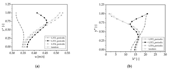 Figure 18b is lower than all other three for 0.3 < y* < 0.75. For y* > 0.75, however, one experiences the high TKE level of the lateral wakes, which is the reason for the rise of this profile in