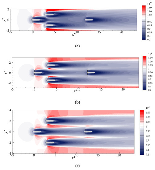 Figure 18a it is convenient to examine the contour plots of nondimensionalized axial velocity u* for the considered three four-turbine periodic arrays. The three subplots of