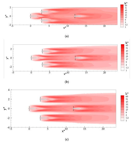 Figure 20a shows that for the smallest transverse spacing T = 2D, the wake of turbine t1 is intercepted by one side of the rotor of turbines t2 and t3, as already seen in the axial velocity contour plot. At this location, the wake of turbine t1 is throttled and the level of TKE in the central part increases due to diversion of peripheral high-TKE flow towards the centerline of turbines t1 and t4. However, the flow also experiences a strong acceleration around abovesaid centerline, and, as a consequence, the TKE level shortly after the wake encountering turbines t2 and t3 rapidly decreases. This is because of the higher recovery rate promoted by the higher flow speed around the centerline. For this reason, the k* profile of this array in