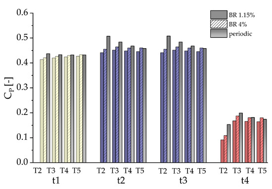 Figure 19. For all array modules considered, turbine t4 in the third row has the lowest power levels, due to this turbine operating in the low-velocity region corresponding to the wake of turbine t1. However, the power of turbine t4 is also that showing the largest sensitivity to the variations of T. In the case of the wall-bounded array modules, the power increases with T until T = 3D, after which a fairly constant level is maintained. The constant power level achieved at higher values of T is slightly higher for the set-up with BR = 4% corresponding to the actual flume tank width. This observation is important in the design of flume tank experiments aiming at studying turbine/wake interactions and draw guidelines for the design of full-scale arrays. With regard to the design of full-scale arrays with many turbines, however, it is more instructive to consider the case of the periodic module, whose examination shows that the value T = 3D maximizes the power capture of turbine t4, as also shown in