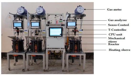 The produced biogas from the reactors was first removed from moisture by passing through a gas washing bottle and then was supplied to the gas drum meter or gas bag for collection. The gas drum meter operates continuously in real-time and measures the quantity of the produced biogas within the reactor and is interconnected with the SENSO control for data logging. The gas bag was used for the temporary storage of the generated biogas in each reactor. The gas bag was connected with each reactor via a control valve. The biogas temperature measurement was made in the connected tube of the gas bag near the control valve. The temperature was measured by a temperature sensor (measuring range: 0–60 °C, accuracy: ±0.2 °C), which was mounted with a T-piece connector. According to the chosen settings at the SENSO control, the gas bag was emptied periodically, during which time the biogas quality was measured by using a gas analyzer (SSM 6000, Pronovza Analysentechnik GmbH & Co., Berlin, Germany). The biogas flow through the gas analyzer was regulated by a control valve via the central control unit.