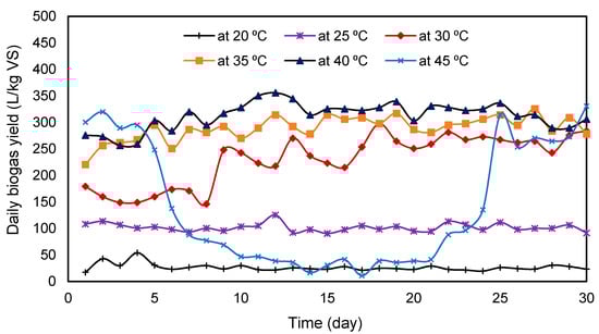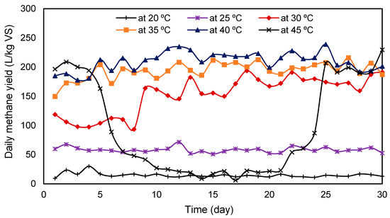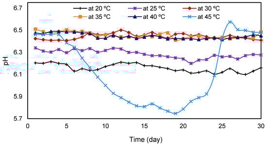 Variation of pH at different temperatures is presented in Figure 2. Fatty acids are formed in the hydrolysis and acidogenesis stage. If the amounts of VFA are higher, they reduce the pH and in the worst case scenario also collapse the system due to the disturbances in activities of acetogens and methanogens [39]. The variation of the pH during the digestion process was monitored continuously. The average pH at 20, 25, 30, 35, 40 and 45 °C temperatures were 6.16, 6.28, 6.44, 6.45, 6.45 and 6.13, respectively. The values of pH at 30, 35 and 40 °C were relatively higher and stable over the experimental period. On the other hand, a low pH was observed at 20 and 25 °C. At 45 °C, pH started decreasing swiftly after day 4 and dropped to 5.75. Due to this drop in pH, the biogas production in the reactor also reduced [10]. The pH at 45 °C started to recover from day 19 and reached 6.57, resulting in improved methanogens’ activity and thus in an improved biogas yield at that point. As the substrate in AD was converted into biogas and the resulting CO2 from biogas reacted with water to produce bicarbonate, the level of pH in the reactor was influenced. Generally, when the pH is influenced, the microbial metabolism is also affected. Rahman et al. [40] observed a low pH at low temperatures, when the conversion rate of organic matter into biogas was low. Also, a high hydrolysis rate contributed to reducing pH due to an increased level of VFA, and thus caused lowered AD efficiency [41]. Vangase and Bartlett [42] observed a drop in pH at high temperature when they studied the effect of various temperatures on the AD of Laminaria digitata.