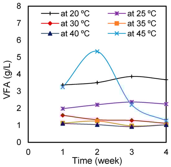 Variation of VFAs at different temperatures are presented in Figure 3. Production of VFAs varied among different temperatures. The VFA values showed a decreasing trend as the temperature increased from 20 °C to 40 °C. High levels of VFAs were observed at 45 °C. The highest accumulation of VFAs (5.34 g/L) was observed during the third week of the experiment at 45 °C, which may be due to a higher rate of hydrolysis or acidogenesis [43]. This high value of VFA reduced the pH and activity of methanogenic bacteria, as a result of which biogas production reduced greatly. From week 3 and onwards, VFA formation at 45 °C started decreasing, causing pH to increase and ultimately to increase methane production. VFA was produced during hydrolysis and acedogenesis stages by acid forming bacteria. This VFA was then converted into biogas by using methanogens in a stable AD process. In this study, accumulation of VFA at low temperatures might be due to reduced metabolic activity of methanogens at a low temperature. Sneath et al. [44] showed that the value of VFA should be less than 2 g/L for the smooth operation of the AD. Hansson [45] observed higher levels of VFA and lower biogas production under a thermophilic condition as compared to a mesophilic condition.
