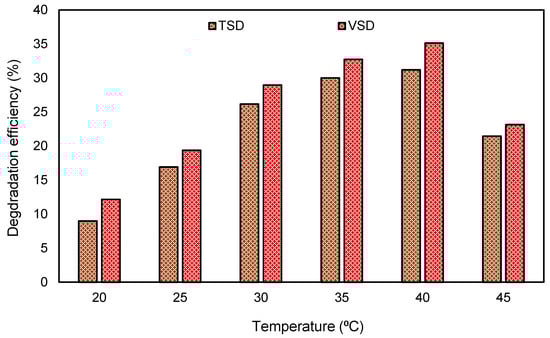 Total solid degradation (TSD) and volatile solid degradation (VSD) are important factors influencing the AD performance. The TSD and VSD values of the substrate during the experiment are presented in Figure 4. The values of TS and VS in the digested manure in all experiments were less when compared to non-digested cow manure (Table 2), as organic contents are utilized to produce biogas through AD. The average TSD at 20, 25, 30, 35, 40 and 45 °C temperatures were 8.99%, 16.91%, 26.16%, 30%, 31.19% and 21.45%, respectively. The highest TSD efficiency was found for the reactor at 40 °C and the lowest was obtained for the reactor at 20 °C. The average VSD at reactor temperatures of 20, 25, 30, 35, 40 and 45 °C were 12.16%, 19.37%, 28.96%, 32.74%, 35.12% and 23.15% respectively. The results showed that the TSD and VSD increased from 20 to 40 °C and then decreased at reactor temperature of 45 °C. Leven et al. [16] found that the degradation capacity at mesophilic temperature was higher than that of thermophilic temperature during their investigation on the effect of temperature to different bacterial communities for the AD of organic household waste. At a mesophilic condition, a higher degree of microbial diversity was observed, and this might have resulted in an enhanced degradation efficiency [16]. Wang and Wan [46] observed that the degradation efficiency of organic compounds increased with increasing temperatures from 20 °C to 40 °C. However, the degradation efficiency started and continued to decline as the temperature increased further from 40 °C to 45 °C.