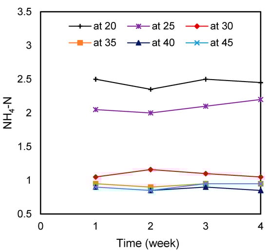 NH4-N concentration at different temperatures (each data point here represents the average of a triplicate experiment).