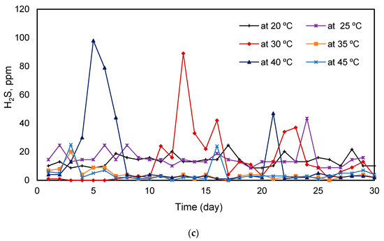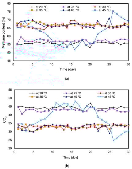 Biogas compositions at different temperatures are presented in Figure 7. The methane, carbon dioxide and hydrogen sulfide concentrations generated during AD were measured. The average methane concentration of the biogas throughout the experiment at 20, 25, 30, 35, 40 and 45 °C was 55.63 (±0.87%), 57.16 (±0.94%), 66.37 (±1.40%), 67.05 (±0.8%), 67.16 (±1.55%) and 61.83 (±6.74%), respectively. The results showed that the methane concentration was low at lower temperatures (20 °C and 25 °C). The methane concentration at 30 °C, 35 °C and 40 °C did not vary considerably, but a wide range of its variation was observed at 45 °C (Table 3). During the start-up period, the methane concentration at 45 °C was high but after day 4, it started decreasing and reached a minimum level on day 16. The high level of methane concentration during the start-up period was possibly due to the accelerated hydrolysis that contributed to enhanced acidogenesis followed by effective methanogenesis [54]. After day 20, the methane concentration started increasing again and the methane concentration at 45 °C was much higher than other reactors over the last 5 days of the experiment, which might be attributed to a shift in the microbial community as the reactor recovered from the period of instability [55]. The concentration of CH4 in the biogas largely depends on pH, as it controls the speciation of the carbonate system and the release of CO2. When the pH is high due to the high alkalinity resulting in from NH3 release, the biogas composition shifts more toward CH4 [56]. Also, according to Bushwell’s equation for theoretical biogas yield [57], the oxidation state of the biomass influences the biogas composition by driving the proportion of released methane. Methane concentration at 40 °C was higher than at other temperatures due to the neutral and stable pH over the course of the experiment, which maintained the stability of the system. High concentrations of CO2 were observed at lower temperatures (20 °C and 25 °C). Carbon dioxide concentrations at 30 °C, 35 °C and 40 °C were low and almost constant over the experimental period, but at 45 °C, higher CO2 concentrations were observed from day 7 to 23 due to the low pH. The concentration of hydrogen sulfide was very low. For all temperature conditions, values of hydrogen sulfide were observed ranging from 0 to 98 ppm. The high value of H2S can reduce the methanation process by poisoning the cell activity. Chynoweth and Isaacson [58] reported that H2S concentrations greater than 6% can limit methanogenesis. In this study, the concentrations of H2S at all temperatures were within the safe operational range.