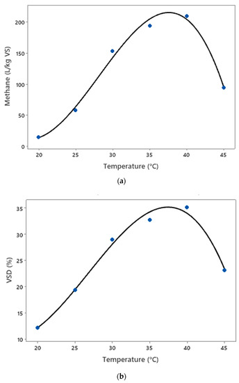 Optimum input settings are required to maximize the methane yield and volatile solid degradation. Best-fit regression equations and standard forms of regression models were analyzed for optimization of temperature using Minitab® 19 (State College, PA, USA).