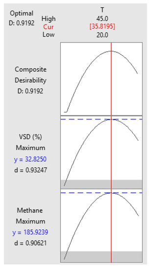 In this study, the relationship between predictor and response variables was developed using regression analysis. All independent variables were fitted to three different models: linear, quadratic and cubic models. The summary of model statistics is presented in Table 4. Temperature was considered as a predictor/independent variable, while methane yield and VSD were considered as response/dependent variables. The best model was selected on the basis of the highest coefficient of regression (R2) and lowest value of standard error of regression (S). After applying these two conditions, the cubic model (Figure 9) was found to be the best fit model. For methane yield and VSD, the values of R2 were 99.04% and 98.84%, respectively. The values of S for specific methane yield and VSD were 12.04 and 1.48, respectively. The regression equations obtained using the cubic model are shown in Table 5. These two equations were used in optimization of the temperature. The temperature was optimized for maximum methane yield and VSD using the response optimizer of Minitab®. The optimum temperature was found to be 35.82 °C, at which the maximum methane yield was 185.92 L/kg VS and maximum VSD was 32.83% (Figure 10), respectively. In optimization, composite desirability is an important factor which determines how well the input settings optimize a group of responses. In this study, the composite desirability was found to be 0.92. A composite desirability close to 1 indicates that the input settings were significantly optimized for maximizing the response variables. This result is in contrast with Rahman et al. [40], who obtained the optimum reactor temperature as 44 °C for anaerobic co-digestion of poultry droppings and sugar mill press mud. In the current study, continuous stirring tank reactors were operated at six mesophilic temperatures ranging from 20 °C to 45 °C. Thus, the difference in optimum temperature from the past study [40] might be due to different substrate characteristics and their co-digestion effect.