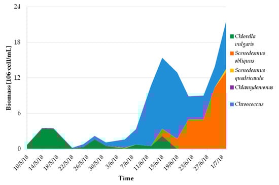 Despite some suboptimal characteristics of the undiluted centrate (high ammonium concentration, high N/P ratio, high turbidity), the microalgae consortium grew stably and the algal biomass concentration was very high for this kind of reactor, being on average 1.2 ± 0.6 g DM L−1. This high concentration was also achieved thanks to the high evaporation, which led to a concentration effect. Average algal productivity was 6.2 ± 1.0 g DM∙m−2∙d−1 during the operation with undiluted centrate, which is coherent with results reported in published experimentations on similar systems [,,]. As for the bioremediation performances, removal efficiencies were computed by comparing the influent and effluent loads for relevant pollutants (details on data processing can be found in Pizzera et al. []) and were on average 99.7 ± 0.7% for ammonium, 86 ± 15% for phosphorus, and 57 ± 15% for organic matter (assessed in terms of chemical oxygen demand, COD). These data demonstrate the algae/bacteria consortia were effective in reducing the pollution load in the centrate and could be applied to reduce the environmental impact of intensive farming, especially in those areas that are classified as sensitive to nitrate according to the European Nitrite Directive (91/676/CEE). The microalgal community was mixed and mainly made up of green microalgae belonging to the Chlorellaceae and Scenedesmaceae families, as well as of cyanobacteria of the Chroococcaceae family with total algal count varying within 0.5–9.0 106 cell mL−1. From July onward, branched green algae belonging to the Chaetophoraceae family became dominant (Stigeoclonium). The biomass used for this study was collected from the pilot plant with four samples from 22/06 to 02/07/2018, therefore it was mainly composed of Scenedesmus sp. and Chroococcus sp. (Figure 1).