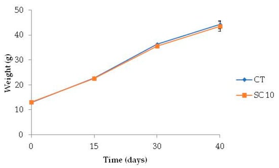 Both CT and SC 10 diets were palatable and accepted by fish. Mortality was 2% on average, and the dietary treatments did not affect any parameters analyzed. The growth of A. baerii fed on the experimental diet throughout the 40-day trial is shown in Figure 2.