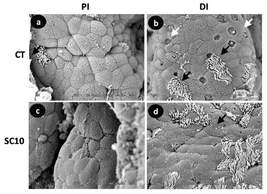 Comparative SEM micrographs from the intestine of A. baerii fingerlings fed the test diets for 40 days. (a) Proximal intestine (PI) of fish fed control (CT) diet; (b) Distal intestine (DI) of fish fed control (CT) diet; (c) Proximal intestine (PI) of fish fed microalgae-supplemented (SC 10) diet; (d) Distal intestine (DI) of fish fed microalgae-supplemented (SC 10) diet. In this species, ciliated cells (black arrows) can be seen alternating with goblet (white arrows) and columnar absorptive cells. SEM bar scale: 20 μm.