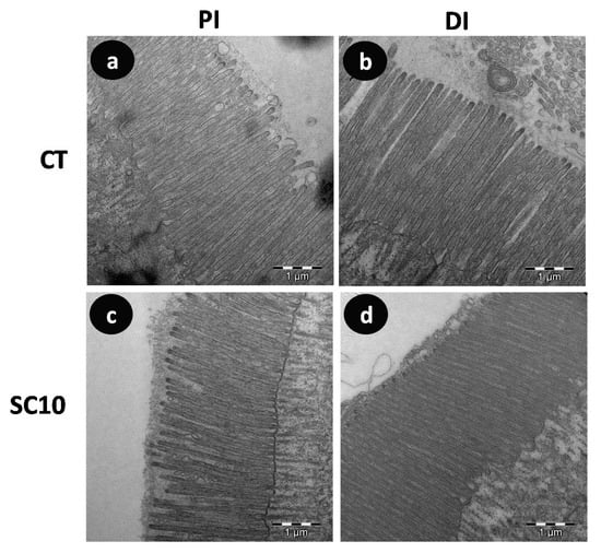 Comparative TEM micrographs detailing microvilli from the intestine of A. baerii fingerlings fed the test diets for 40 days. (a) Proximal intestine (PI) of fish fed control (CT) diet; (b) Distal intestine (DI) of fish fed control (CT) diet; (c) Proximal intestine (PI) of fish fed microalgae-supplemented (SC 10) diet; (d) Distal intestine (DI) of fish fed microalgae-supplemented (SC 10) diet. TEM bar scale: 1 μm.