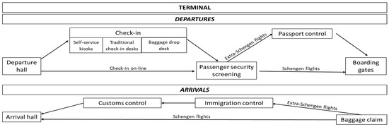 - Guizzi, G.; Murino, T.; Romano, E. A discrete event simulation to model passenger flow in the airport terminal. In Proceedings of the 11th WSEAS International Conference on Mathematical Methods and Computational Techniques in Electrical Engineering, Stevens Point, WI, USA, 28 September 2009. [Google Scholar]