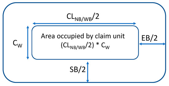 Figure 3 shows a scheme of the baggage claim facilities with the following meaning of the acronyms: CL(NB/WB) is the carousel frontage for passenger line up for narrow body (NB) or wide body (WB); Cw is the carousel width; SB is the side buffer to allow passenger movement around the reclaim belt on both sides; and EB is the end buffer to allow passenger movement around the reclaim belt on both sides.
