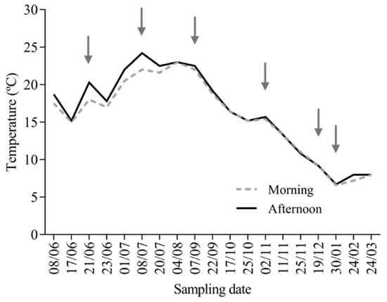 Fish sampling data and the temperature (°C) conditions of the water during the morning and afternoon, as measured in the cages located at the Rabagão river dam from June 2016 until March 2017. The arrows point to the temperature in the days of sampling.