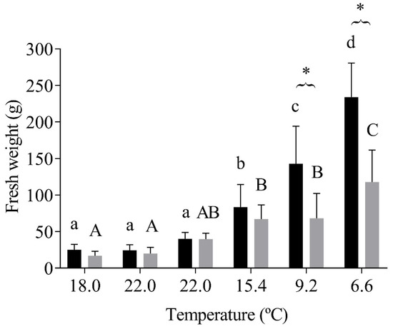 Diploid and triploid fish’s fresh weight (g) at each sampling temperature. The values are expressed as mean ± SD, n = 10. Different letters mean significant differences among water temperature variations to each group; * represents differences between diploid and triploid fish (Sidak post hoc test, p ≤ 0.05).