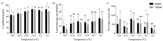 Significant alterations in antiprotease activity were observed due to temperature (p < 0.0001), and among diploid and triploid fish (p = 0.007), mainly in winter, at 6.6 °C (Figure 3a). The lysozyme activity was significantly increased after a decrease in water temperature to 6.6 °C in both fish (p = 0.0002, Figure 3b). The peroxidase activity was significantly altered by seasonal water temperature changes (p < 0.0001), with significant differences between diploid and triploid fish observed at 9.2 °C (Figure 3c).