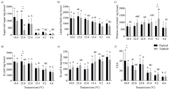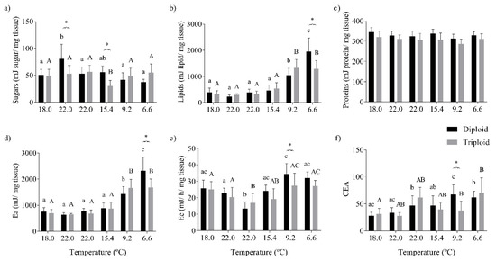 Energy budget of the muscle tissue of diploid and triploid O. mykiss, along with seasonal temperature variations: (a) sugars (mJ/mg tissue), (b) lipids (mJ/mg tissue), (c) proteins (mJ/mg tissue), (d) energy available (Ea, mJ/mg tissue), (e) aerobic energy production (Ec, mJ/h/mg tissue), and (f) cellular energy allocation (CEA). Values are expressed as means ± SD, n = 10. The different letters indicate significant differences between the temperatures within each group; * represents differences between diploid and triploid fish for each specific group of temperatures (Sidak post hoc test, p ≤ 0.05).