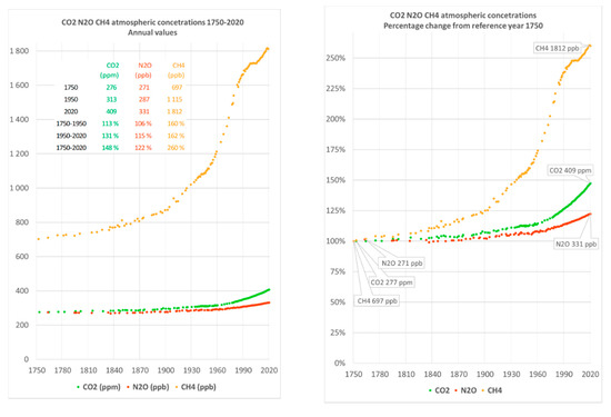 Atmospheric gas concentrations of CO2, N2O and CH4 from 1750 to 2020 (Source: compiled by the authors; Data sources: [24,25]).