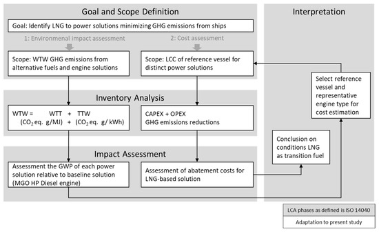 The present study includes first an environmental WTW assessment of distinct power solutions, followed by an economic assessment of a reference vessel, as shown in Figure 2. The focus was on identifying appropriate fuel/engine solutions for lowering GHG emissions. The fuels assessed, in order of refinement and—typically—cost were the traditional Heavy Fuel Oil (HFO), followed by two finer alternatives: Marine Gas Oil and Very Low-Sulfur Oil (MGO and VLSFO), finally followed by Liquefied Natural Gas (LNG). The engine solutions considered were high pressure diesel (HP Diesel) and low-pressure Otto dual fuels (LP Otto DF) engines, which were 2- and 4- strokes types. The combination fuels/engines selected for the analysis are all compliant with present IMO air emission regulations. For the economic assessment, the scope was narrowed down to one vessel type Supramax dry bulker 63000 dwt and one engine type. Globally there are around 3000 Supramax vessels which together perform nearly 10% of the world’s sea freight work measured in tons of nautical miles [59]. While this example is not representative of the global fleet and limits the possibility to generalize the results, it is a very relevant case and covers the largest segment in terms of type and size category.