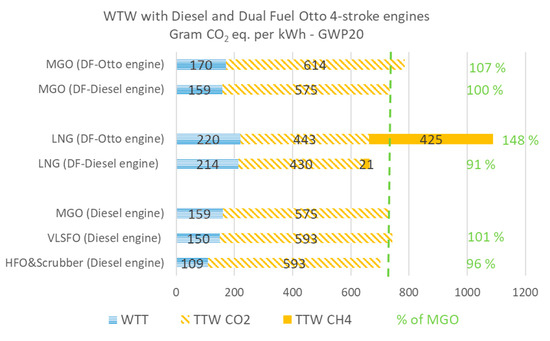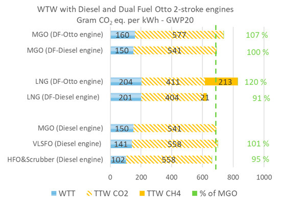 For emissions contributing to air pollution, locally and regionally, there is an accepted consensus that natural gas (LNG) delivers major reductions when the fuel is combusted in the ship’s engines (or gas turbines) compared to diesel (marine gas oil, MGO) and traditional bunker fuel (heavy fuel oil, HFO) [15,16]. LNG does not contain sulfur and thus there are no emissions of sulfur oxides (SOx). Emissions of Particulate Matter (PM) are also much lower from combustion of LNG. Emission of Nitrogen Oxides (NOx) is governed by combustion process parameters, with temperature being the dominant parameter. Thus, NOx emissions will vary depending on the engine technology and is not directly related to the fuel. Using LNG in low pressure Otto-process engines typically results in very low NOx emissions. It was these advantages which triggered the first development projects of LNG for maritime applications in the late 1980s. In addition, with its high hydrogen-to-carbon ratio, LNG is often seen as a promising option to reduce maritime GHG emissions. If one estimates emissions and energy based on the combustion stage only, LNG results in about 25% lower CO2 emissions than conventional fuels like diesel or bunker fuel. Such estimates are called Tank-to-wake (TTW) [14]. When one includes Well-to-tank (WTT) estimates of emissions for the LNG supply chain (from extraction through logistics to the vessel’s tanks) as well as un-combusted methane (CH4) from the ship’s engine(s), these additional emissions will reduce and in the worst case more than nullify any Greenhouse gas (GHG) gains from LNG relative to HFO or MGO, as documented in recent studies of life-cycle emissions from marine engines [17,18,19].