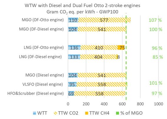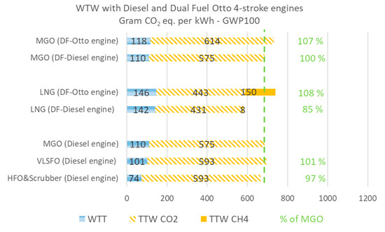 From Table 4 we observe: First, that LNG combusted in a dual fuel diesel engine reduces GHG emissions with 9–15% compared to MGO; Second that LNG combusted in a dual fuel Otto-engine increases GHG emissions significantly in a short-term horizon (GWP20), and even with a long-term horizon (GWP100), it gives only marginal reductions compared to MGO. Third, when the Otto dual fuel engine run purely on MGO, the GHG emissions increase by around 7% compared to when the MGO is combusted in either a pure diesel engine or a dual fuel diesel engine. These results are visualized in Figure 3; Figure 4, displaying values for GWP20 and GWP100, respectively in grams of CO2 eq. per kWh for WTT, TTW and methane slip for the investigated fuel and engine combinations. Finally, the vertical dashed line shows the WTW value for the reference fuel, i.e., MGO, and the green number relative value for each fuel in % of the MGO-baseline.