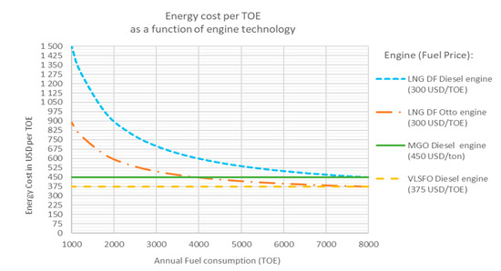 The main observations from the sensitivity analysis are: First, LNG in combination with an DF Otto engine is economically competitive even at quite low annual fuel consumptions, i.e., from 4000 TOE upwards. However, even if it easily fulfils the EEDI phase 3 requirement (Lindstad and Bø 2018) [68], the real GHG reduction is next to nothing, i.e., around 4%; Second, LNG in combination with a DF diesel engine increases costs significantly, unless the fuel consumption is high. But in contrast with the DF Otto engine, a DF diesel engine delivers 15% GHG reduction of Well-to-wake emissions, which at least is more appropriate by providing the 30% reduction in Tank-to-wake emissions required by EEDI phase 3. Importantly, while the GHG reductions from LNG, even with best engine technology (i.e., dual fuel diesel engines), are modest, ships with these engines can with modest modification switch to using ammonia produced with renewable energy when it becomes available in sufficient amounts.