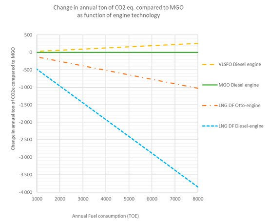 The main observations from Table 7 is that if the fuel price of LNG is lower than the fuel price per energy unit for VLSFO and MGO, then LNG in combination with a Dual fuel Otto engine becomes a very cost competitive option. In contrast, LNG with a Dual fuel diesel engine cost increases compared to all other options. With a high LNG fuel price, LNG is not cost competitive versus either MGO or VLSFO. Nevertheless, even with a high LNG price, combining LNG with a dual fuel Otto engine would be an easy way to fulfil IMO phase 3 EEDI regulations. Figure 7 shows how these findings are influenced by variations in annual fuel consumption where the LNG is based on the low estimate presented in Table 7. Similarly, Figure 8 shows the change in annual GHG emissions CO2 eq.) for the assessed fuel and distinct engine technologies.