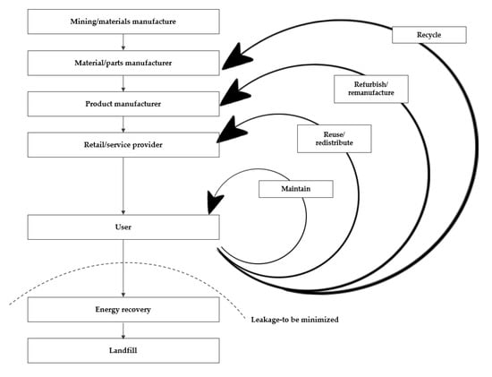 Stahel and Reday-Mulvey [] note that a business model can enhance a product’s life through reuse, remanufacturing, and maintenance. They emphasize changes from ownership to stewardship, where consumers become the users and creators as, according to them, remanufacturing and repairing old goods creates skilled jobs. Stahel [] emphasizes recycling at the material level in a circular economy from selling products to selling services. This model could become an ultimate business model for closing the loop. These authors assert that, in a circular economy, recycling and reusing materials on a molecular level becomes an important business model.