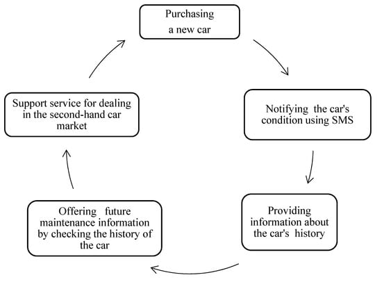 To maximize product life extension and to extend its material use, Hyundai (see Figure 3) uses a new service model called the ‘Blue Members’ model by adopting IoT. The Blue Members service has been operating in the process of purchasing a car from the second-hand car market through to destroying a car. When purchasing a new car, an owner automatically gets membership of Blue. Over time, an owner receives information about the car’s current engine condition, when to change the oil, and its tire condition. Hyundai Automotive Enterprise also provides customized leisure related information such as information about a restaurant that the owner visits frequently. If the car owners are fans of a certain baseball team, they can match dates and information about promotions and events that the company is holding.