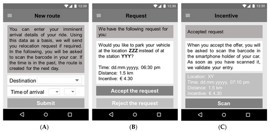 Prototypical interfaces. (A) Rental information input. (B) Relocation task request. (C) Relocation start.