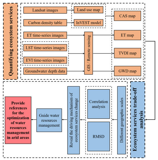 As a regulating ecosystem service, CAS plays an important role in the study of the carbon cycle, carbon sinks/sources, and climate change mitigation in arid areas [31]. The water cycle is another important supporting ecosystem service in arid areas; ET, soil moisture and groundwater are its important components, and are the prerequisites for the provision of ES [3]. In addition, soil moisture and ET are scarce regulating services in arid areas [13,31], while groundwater is an important water storage and water supply service, and is one of the most functional suppliers of life support in arid areas [3,30]. Therefore, this study selected four important ES that affect the carbon and water cycles of the basin ecosystem in arid areas, from the regulating ecosystem services (carbon storage (CAS), evapotranspiration (ET)), supporting ecosystem services (soil drought index (TVDI)) and provisioning ecosystem services (groundwater depth (GWD)), by quantifying ES and their trade-offs/synergies, revealing the driving mechanism of the changes in ES in order to guide the management of water resources in arid areas, and to provide a scientific reference for the optimal management of water resources in arid areas (Figure 1).