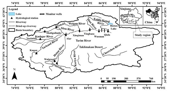 The Tarim River basin (34.20–43.39° N, 71.39–93.45° E) is located in southern Xinjiang, China, adjacent to the Taklimakan Desert (Figure 2). The basin consists of 144 tributaries in nine major rivers, namely the Aksu River, the Yarkand River, the Hotan River, the Keriya River, the Dina River, the Kashgar River, the Kaidu-Kongqi River, the Weigan River, and the Cheerchen River [30]. The Tarim River is 1321 km long, with a total area of 1.02 × 106 km2 [33]. It does not produce its own run-off, and is a pure dissipative inland river. The run-off mainly comes from melting ice and snow in alpine areas. It is divided into four river sections: Alar-Xinqiman, Xinqiman-Yingbaza, Yingbaza-Wusman, and Wusman-Qiala sections. In recent years, due to the over-exploitation of soil and water resources, only the Aksu, Hotan, Yarkand, and Kaidu-Kongqi Rivers discharge into the Tarim River, forming a pattern comprising four sources and one trunk [27]. The study area is a typical temperate arid continental climate, with an average temperature of 10.5–11.4 °C, annual precipitation of only 20 mm, and evaporation of up to 2500–3000 mm. The desert riparian forest in the Tarim River basin is composed mainly of Populus euphratica and Tamarix, and the herbs include reed, Apocynum venetum, and licorice (Glycyrrhiza glabra), amongst others [33]. The lithology of the aquifer in the main stream of the Tarim River is basically the same, with fine silty sand and medium fine sand above 300 m. Therefore, the water permeability and richness of the aquifer are uniformly distributed, with little change [61].