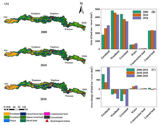 The spatial distribution of the land use/cover (A), the area of the land use/cover (B), and the area change of the land use/cover (C) in the mainstream area of the Tarim River over the period 2000–2018.