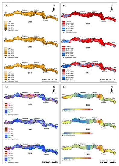The spatial distribution of land use/cover types in the Alar-Qiala section of the Tarim River basin in 2000, 2010, and 2018 is shown in Figure 3A. Woodland, grassland, farmland, and unused land were the main land types in this area (Figure 3B). With the protection and restoration of vegetation driven by the policy of unified water resource management, the land use area and structure have changed significantly [48]. From 2000 to 2018, the farmland, water area, construction land and unused land in the Alar-Qiala section of the Tarim River basin showed an increasing trend, in which the farmland area increased by 11.66 × 104 hm2—a significant increase of 65.03%—and unused land increased by only 1%. There was a decreasing trend in woodland and grassland areas, with grassland areas decreasing by 9.09 × 104 hm2, with the largest decrease reaching 20.78%, and woodland areas decreased by 5.06 × 104 hm2: a decrease of 10.50% (Figure 3C). In addition, compared with 2000–2010, the rate of the increase of the farmland area, and the rate of the decrease of the grassland and woodland areas were significantly lower in 2010–2018. This shows that the expansion of farmland in the Tarim River basin has been effectively controlled and the restoration of woodland and grassland has improved following the implementation of the comprehensive management of the Tarim River, and the unified management of water resources in the basin. From 2000 to 2018, the land use transfer in the Aral-Qiala section of the Tarim River basin mainly occurred between farmland, woodland, grassland and unused land (Table 2). Farmland was the main importer, while grassland and woodland were the main exporters. From 2000 to 2010, the increased farmland came mainly from grassland, accounting for 64.81%; from 2010 to 2018, the increased farmland came mainly from woodland, accounting for 53.33%.
