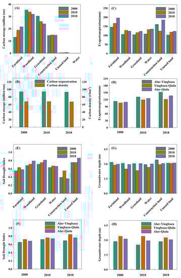 The carbon storage of the land use/cover (A); the carbon storage and carbon density (B); the evapotranspiration of land use/cover (C); the evapotranspiration in the different river sections (D); the soil drought index of the land use/cover (E); the soil drought index in the different river sections (F); the groundwater depth of the land use/cover (G); and the groundwater depth in the different river sections (H) in the mainstream area of the Tarim River during 2000–2018.