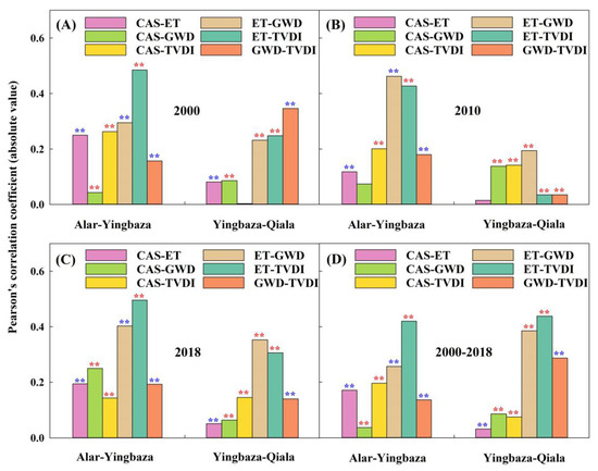 The spatial correlation of paired ecosystem service indicators in the different river sections for each time period (** indicates significantly positive correlations, p < 0.01; ** indicates significantly negative correlations, p < 0.01; no * indicates p ≥ 0.05. CAS = carbon storage, ET = evapotranspiration, TVDI = soil drought index, GWD = groundwater depth).