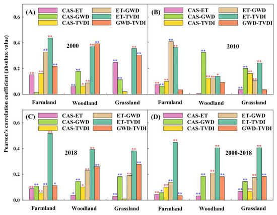 For different land use/cover types, the trade-offs/synergies between ES were not the same on different spatial and temporal scales (Figure 7). For woodland and grassland areas, CAS–ET had a synergistic effect over the entire study period, but it was a trade-off relationship in farmland areas; ET–GWD showed a synergistic effect in farmland areas, but was a trade-off in woodland and grassland areas. In other words, there was a space–time scale dependence of trade-offs/synergies between ES. In addition, among the other ES, CAS–GWD (except 2000–2018, low significant synergy, p < 0.05) and GWD–TVDI (except 2018, low significant synergy, p < 0.05) showed significant synergy (p < 0.01) over the entire study period, and CAS–TVDI (except 2018, low significant trade-off, p < 0.05) showed a significant trade-off relationship during the entire period, which is consistent with the results of the studies in the different river sections.