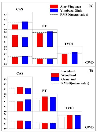 In order to better understand the changes in the ecosystem service trade-offs, the RMSD of the paired ES in the different sections and land use types was determined (Figure 8). In the different river sections, there were some differences in the trade-off intensity of ES over the period from 2000 to 2018. In all of the paired services (except CAS–TVDI), the RMSD of the Yingbaza-Qiala section was higher than that of the Alar-Yingbaza section (Figure 8A). For the different land use/cover types, overall, the RMSDs among all of the paired services (except CAS–TVDI) were lower for grassland than for woodland areas (Figure 8B).